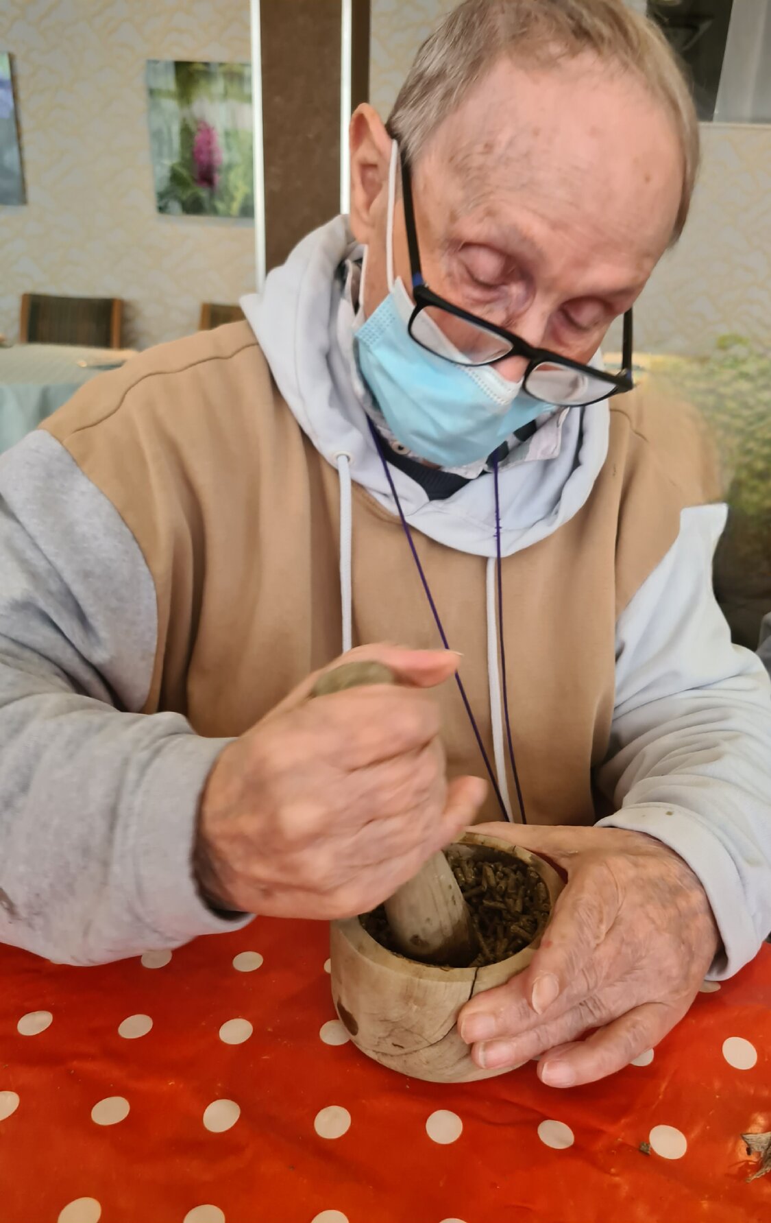 Céline, notre zoothérapeute, veille à que chacune de ses interventions la nouveauté en séance arrive auprès de nos résidents.